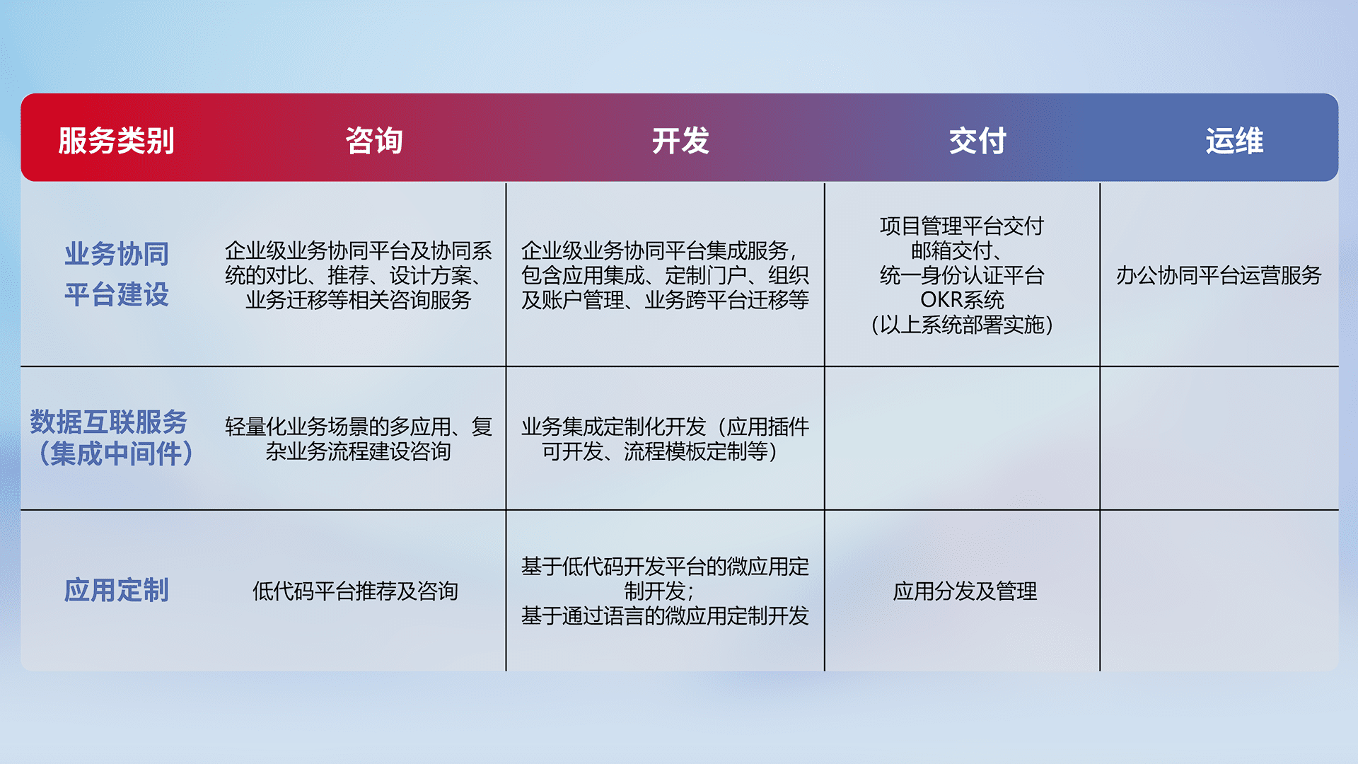 针对钉钉、、企微、、IDaas等平台级产品提供产品的规划、、方案、、交付、、定制化开发等服务,,,实现如统一协同办公、、、智能客户服务、、、、混合会议管理、、、、智能数据查询、、、等业务场景,,,实现数字化转型。。。。