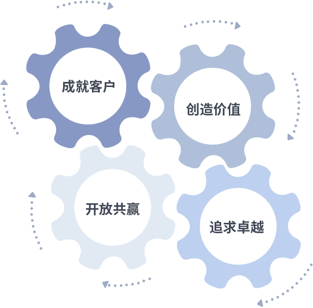 成就客户是一切决策的出发点,,,创造价值是衡量所有工作的标准,,,追求卓越是我们做事做人的态度,,,,开放共赢是我们的格局也是最终的结果。。。。价值观的齿轮环环相扣,,,推动着组织里的每个人不断向前。。。。